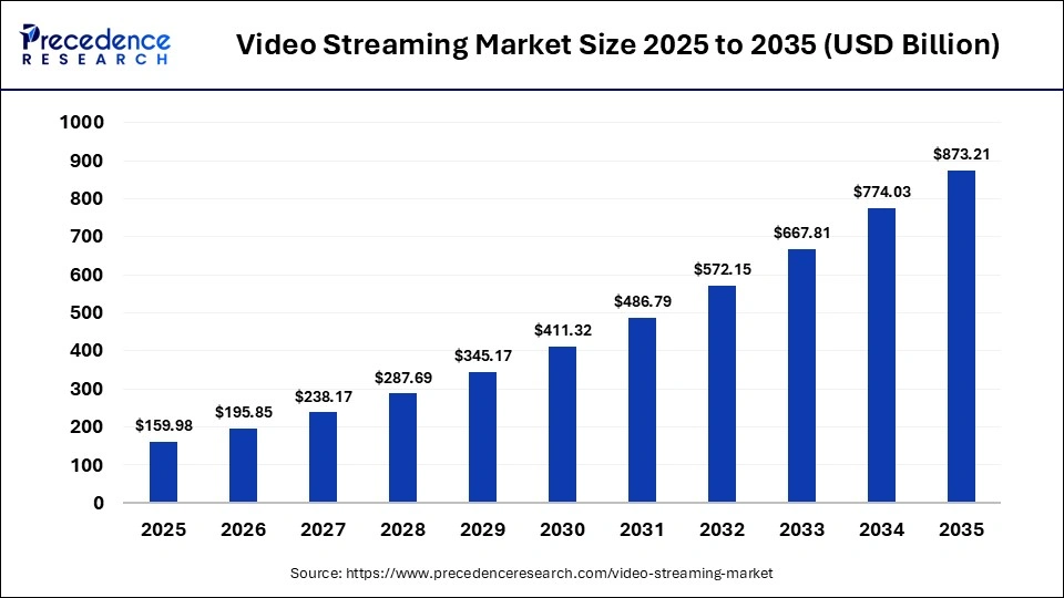 Ottawa, Feb. 23, 2026 (GLOBE NEWSWIRE) -- The video streaming market size was USD 159.98 billion in 2025 and is projected to reach USD 195.85 billion by 2026, growing at a CAGR of 18.5% from 2026 to 2035, ultimately reaching around USD 873.21 billion by 2035. Increasing consumer spending on media is the key factor driving market growth. Also, a surge in global access to affordable internet services and smartphones, coupled with rapid technological innovations, can fuel market growth further.